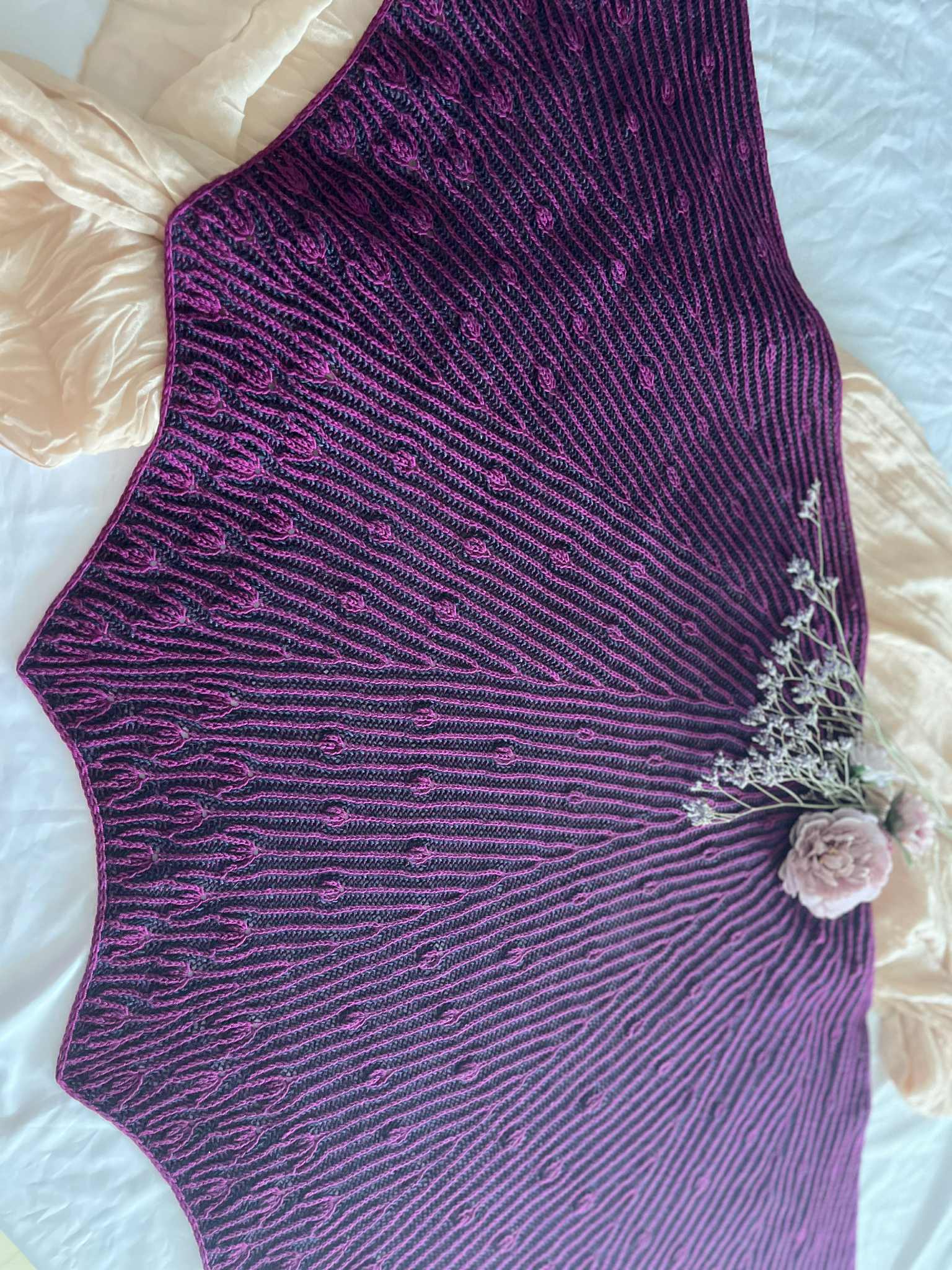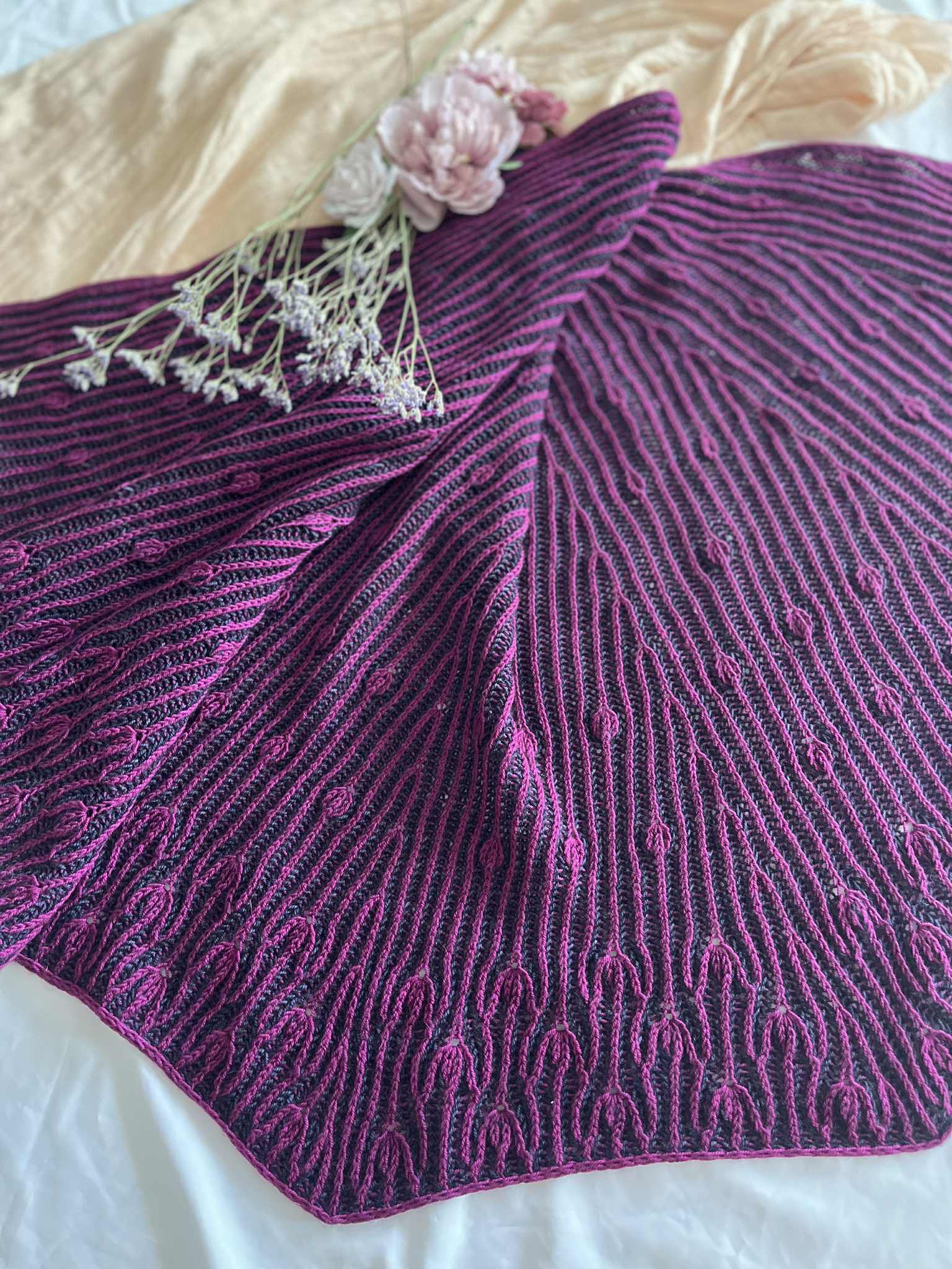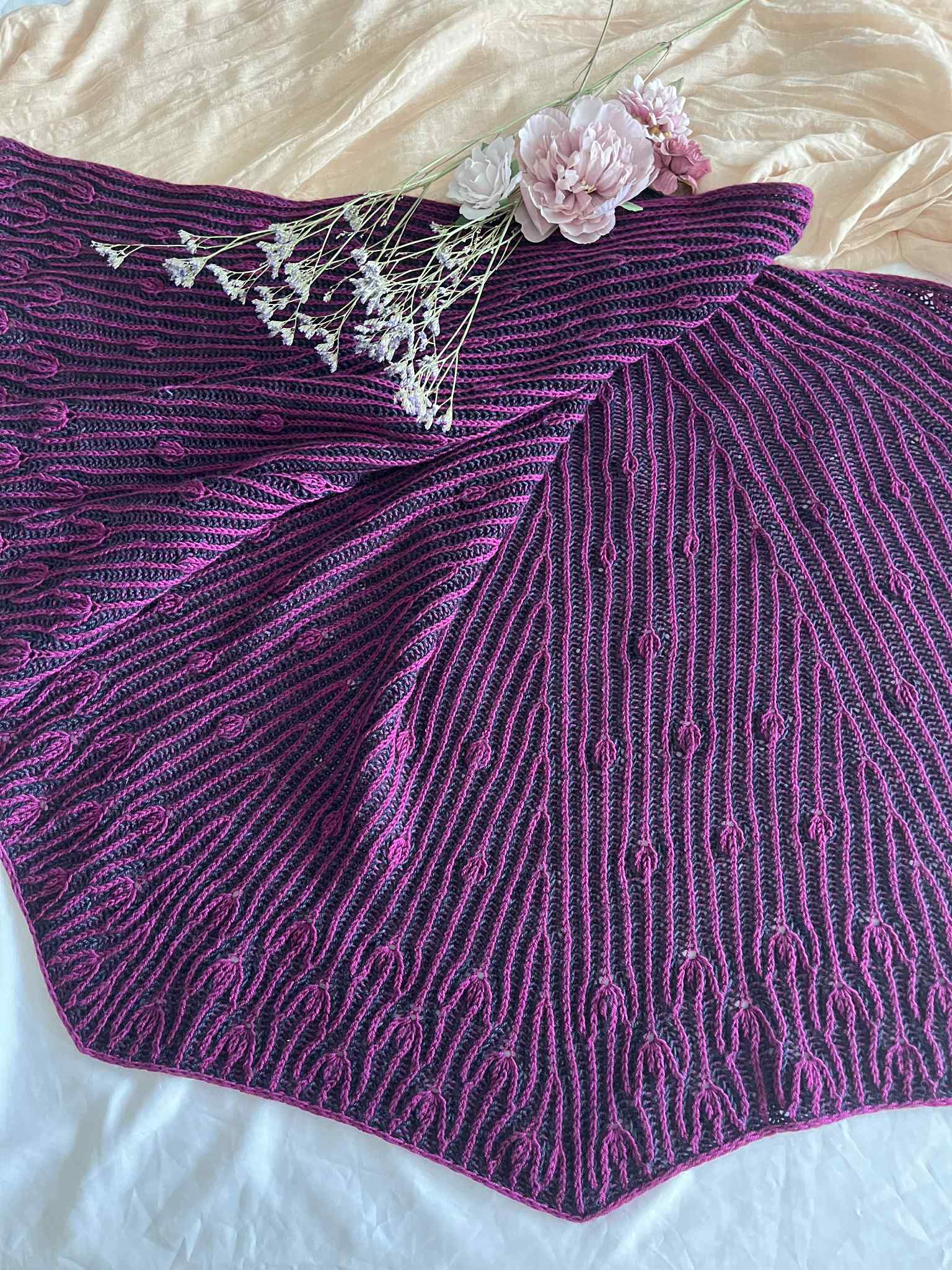 Comme des boutons de fleurs prêts à éclore au cœur du printemps, ce châle se déploie dans une danse délicate et rythmée.