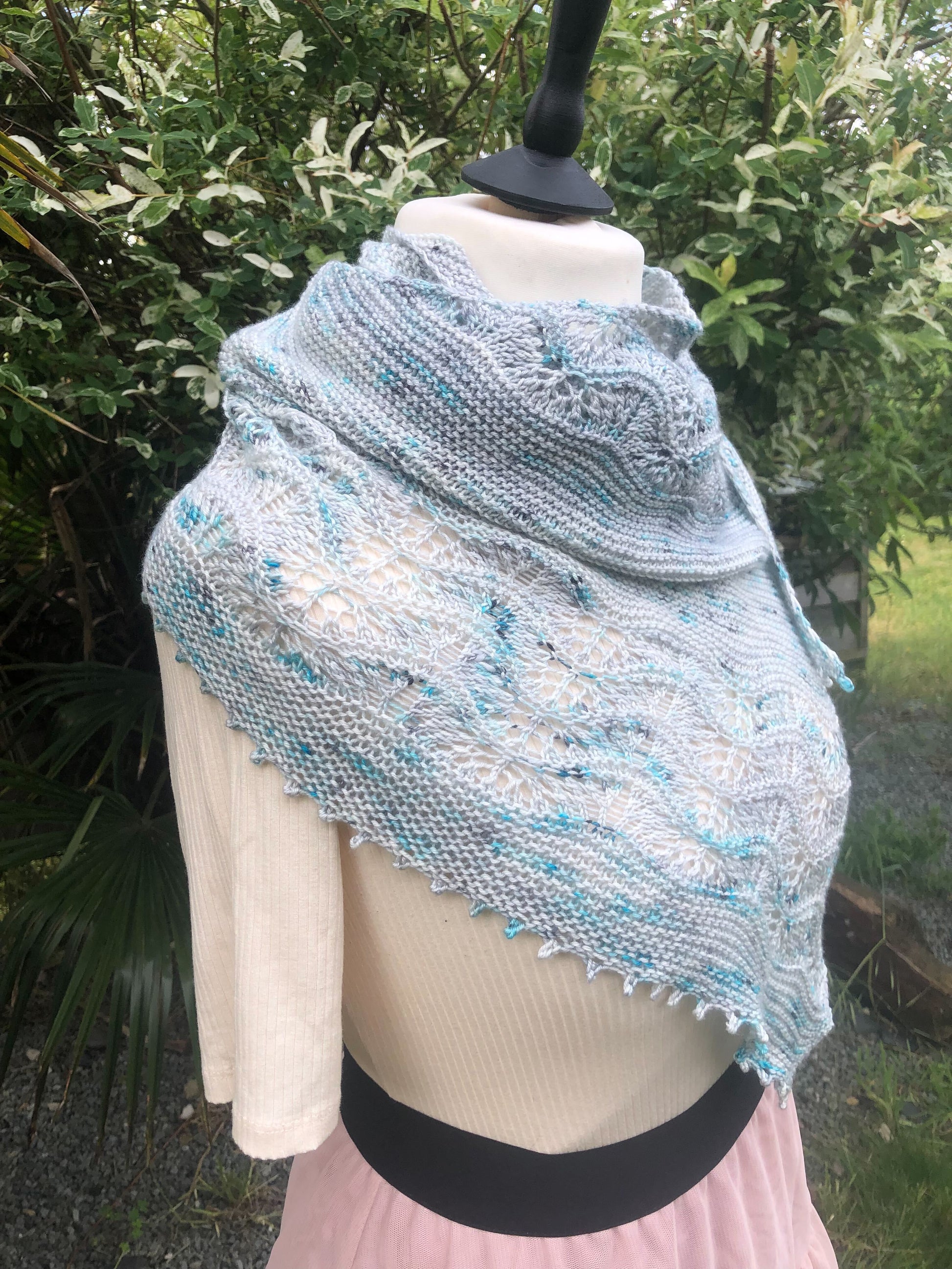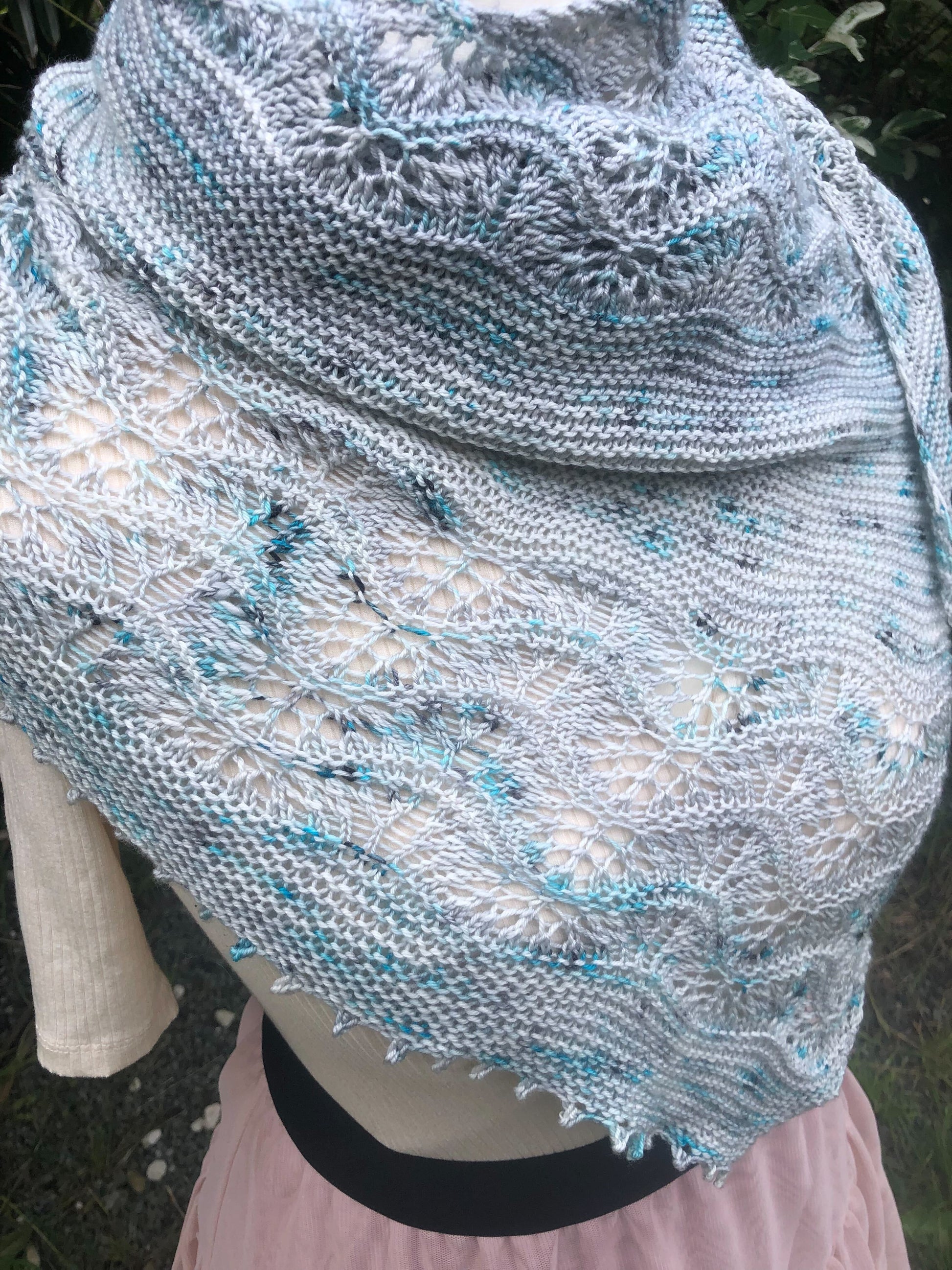 Le châle Azuré est issu de ma collaboration avec Nathalie et sa très jolie base Céleste en merino et soie. Quand j’ai reçu mes écheveaux, j’ai tout de suite imaginé un châle aérien et tout en longueur pour pouvoir le poser délicatement sur ses épaules, tel un papillon ou encore autour de son cou avec un tombé féminin sur l’épaule. La forme telle une aile de papillon s’est alors imposée à moi et le nom facilement trouvé également.