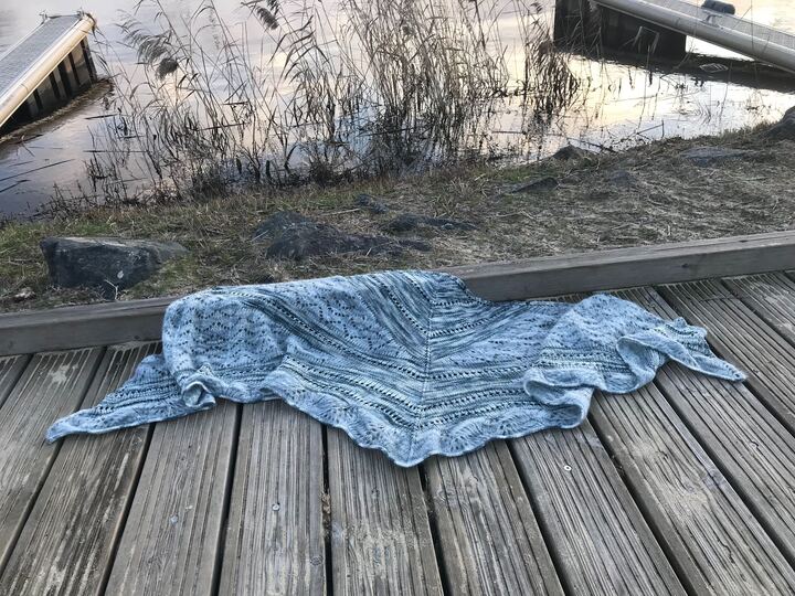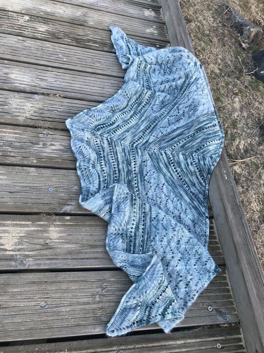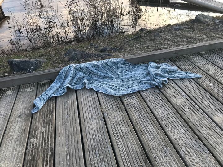 Le châle Centaurée mesure 2,35 m de longueur d'une pointe à l'autre et 55 cm de profondeur.
