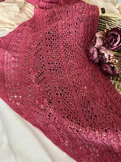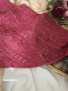 Le châle Mitsu est une caresse de dentelle, un souffle léger posé sur les épaules. Tricoté avec un seul écheveau de mérinos et soie, il dévoile un motif aérien, délicatement ajouré, qui danse sous les doigts comme une brise printanière.