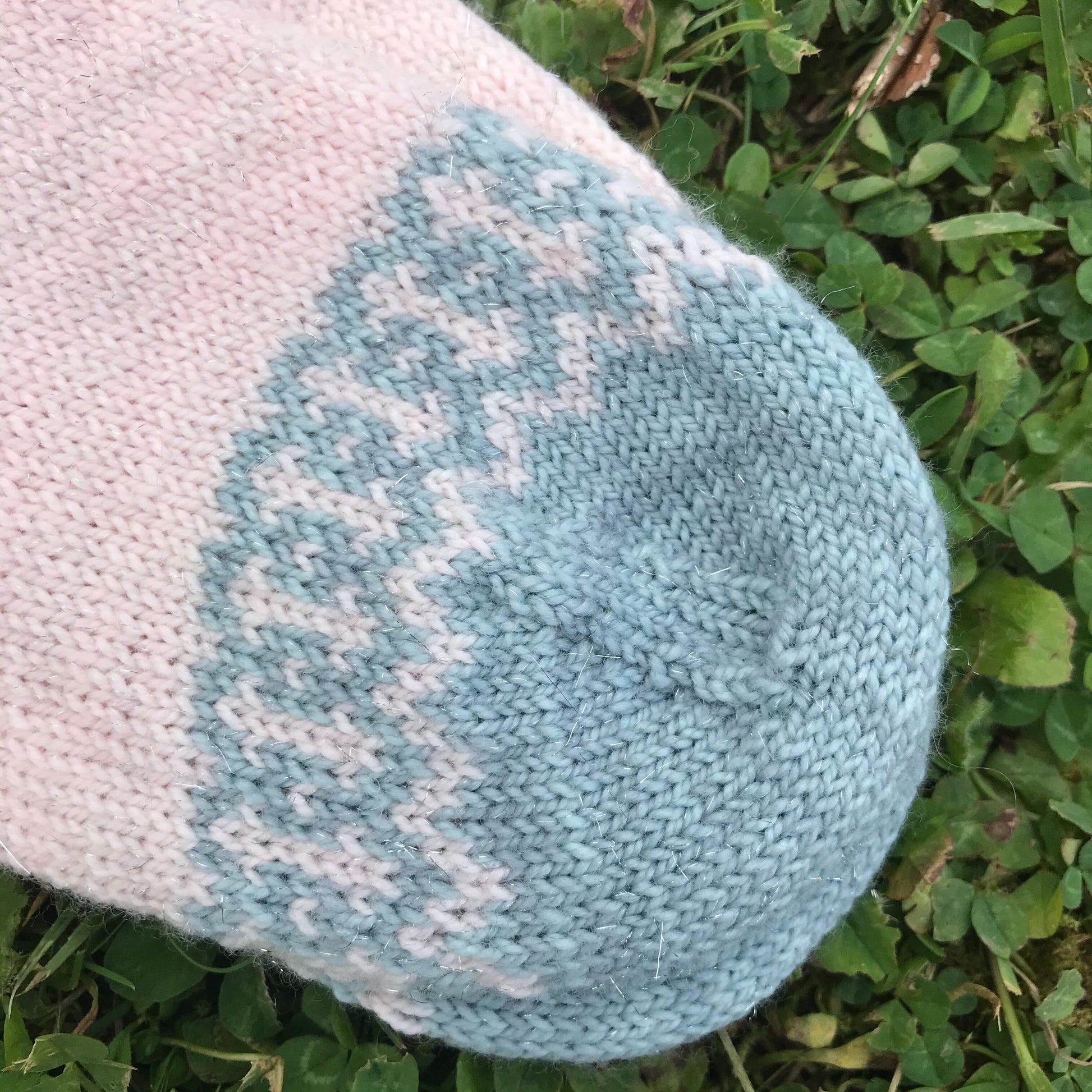 Le modèle présenté est réalisé avec la laine à chaussette de Heidi Idéa en coloris mirage et darling et le talon n°2.