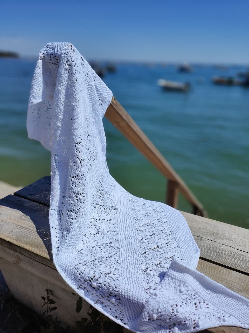 Elle se tricote de bas en haut avec des jeux d’augmentation et de diminution pour lui donner une forme de parallélogramme qui se positionne parfaitement sur vos épaules et sur vos bras. L’étole vous est proposée en 3 longueurs différents. Vous trouverez sur les photos la plus petite taille.