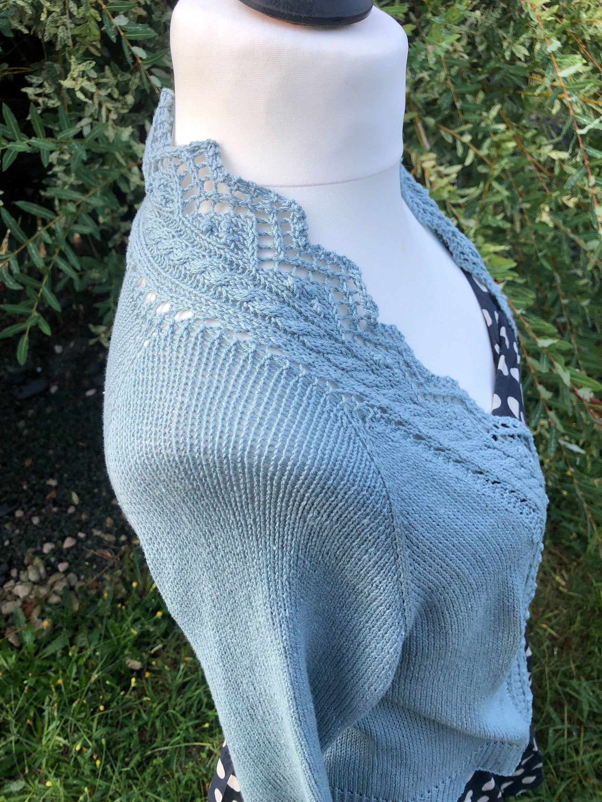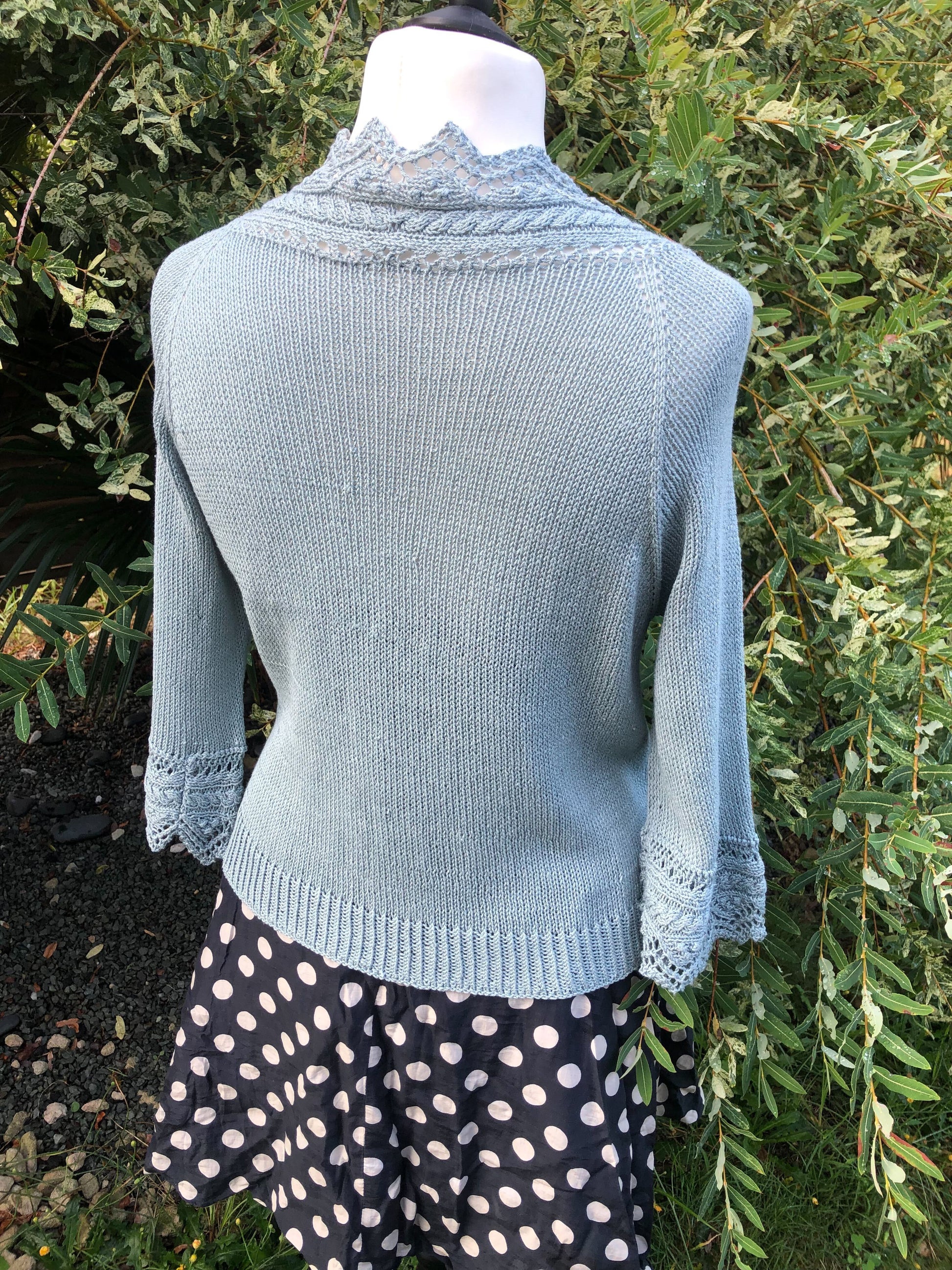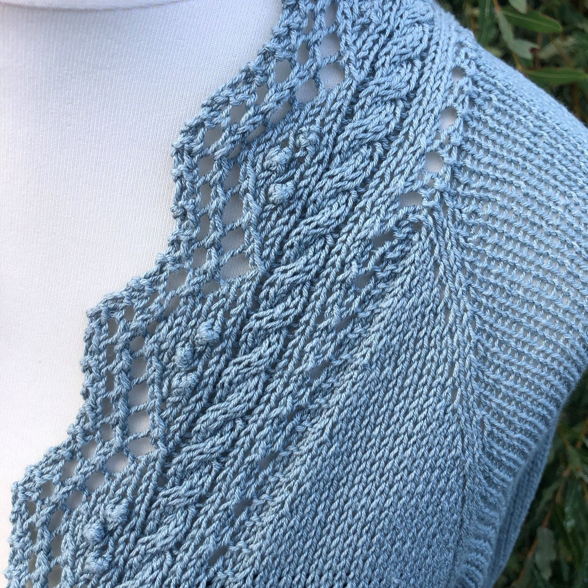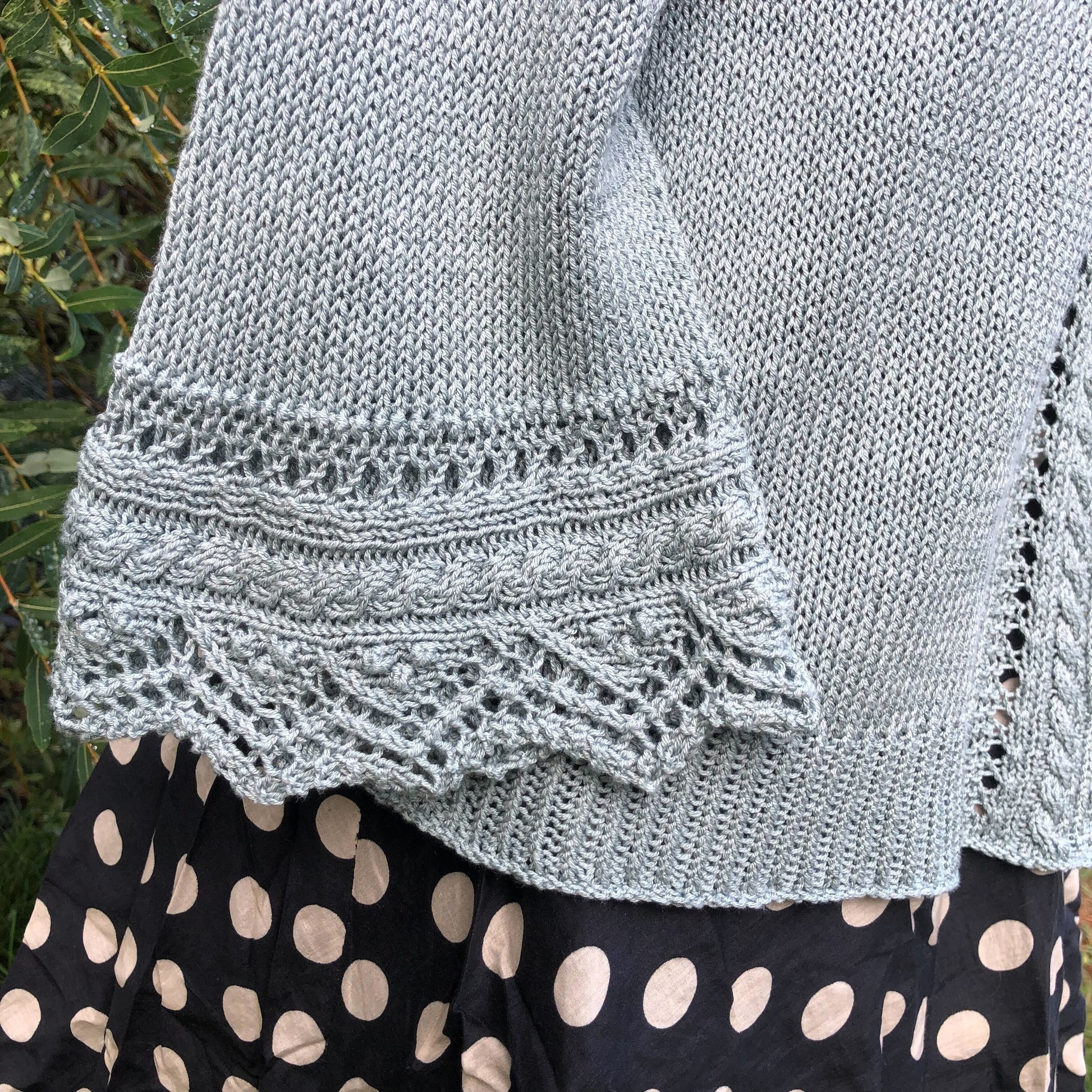 Givre est un gilet top-down avec une jolie finition en dentelle qui se tricote en même temps que le corps. Les manches larges façon kimono sont elles aussi parées de dentelle à la place de côtes classiques.