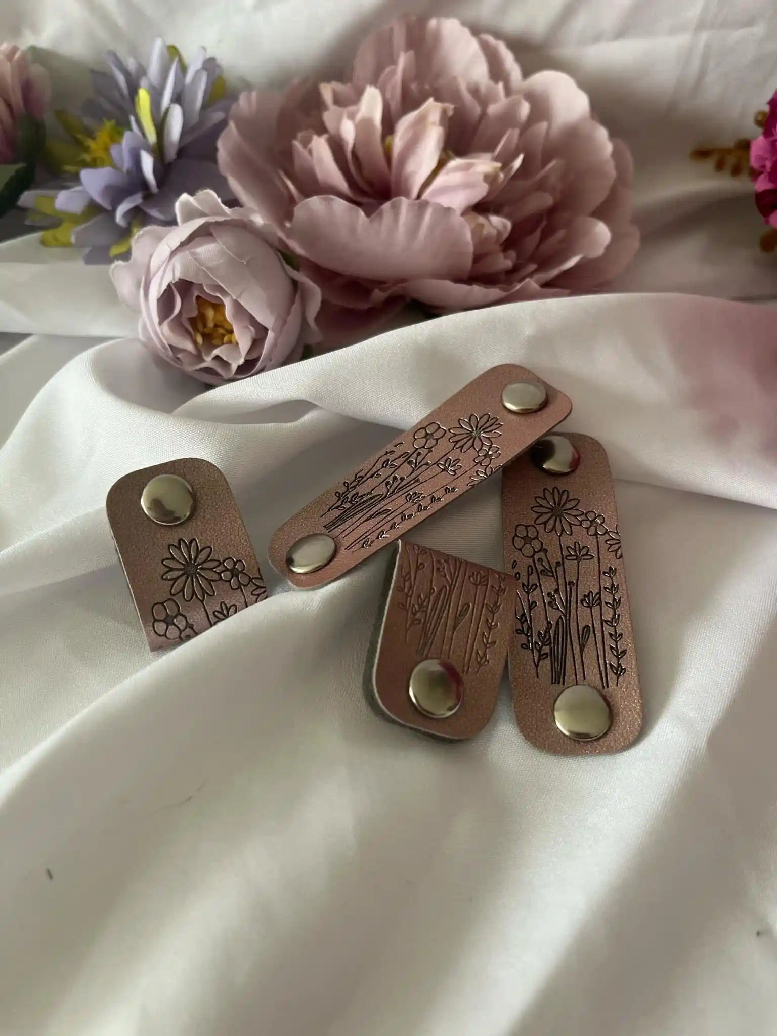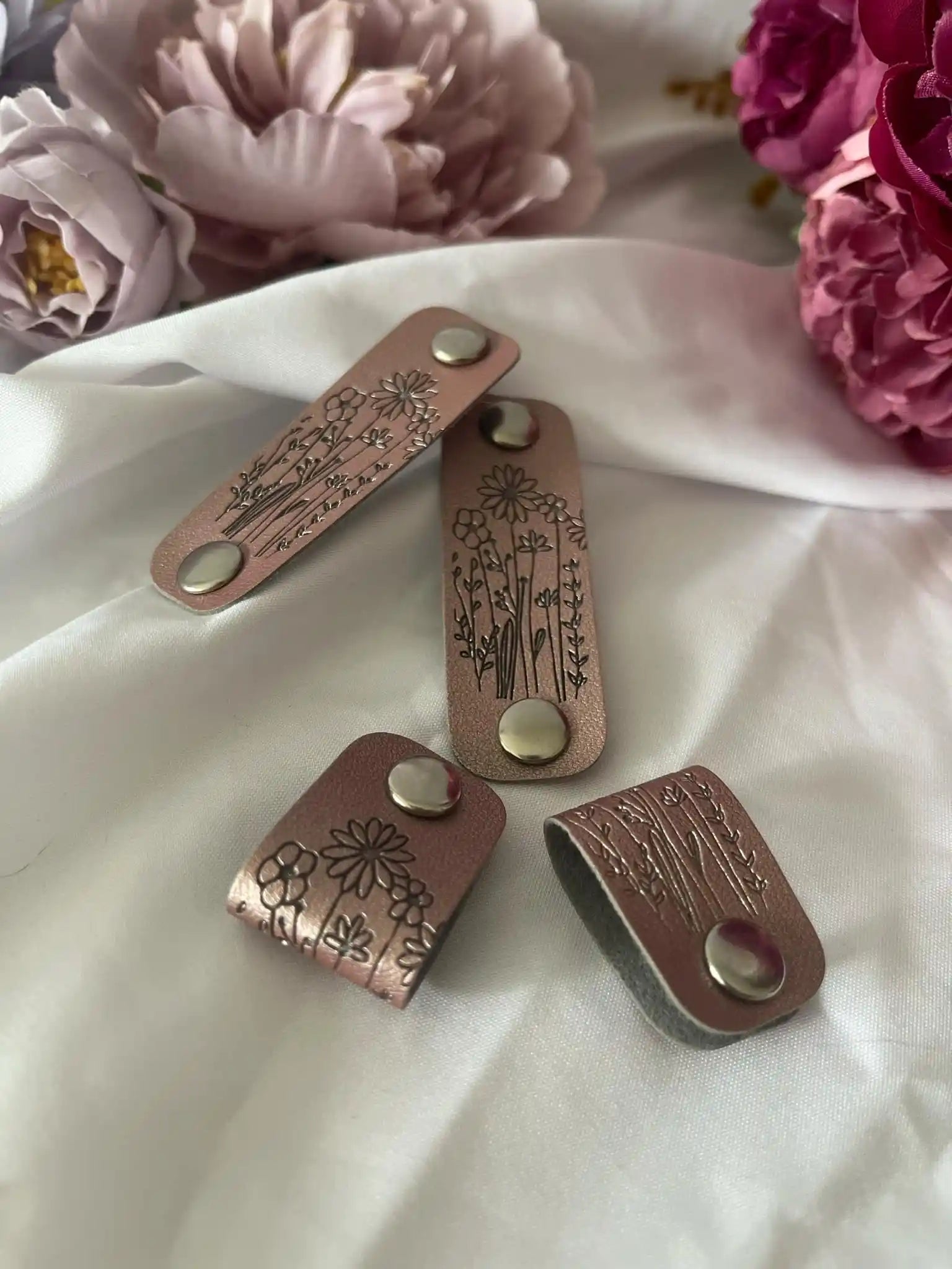 Ajoutez une petite touche d'élégance ou de personnalisation à votre bonnet, votre pull, votre projet avec cette jolie étiquette à clipser fleur (or rose), totalement amovible, en imitation cuir !