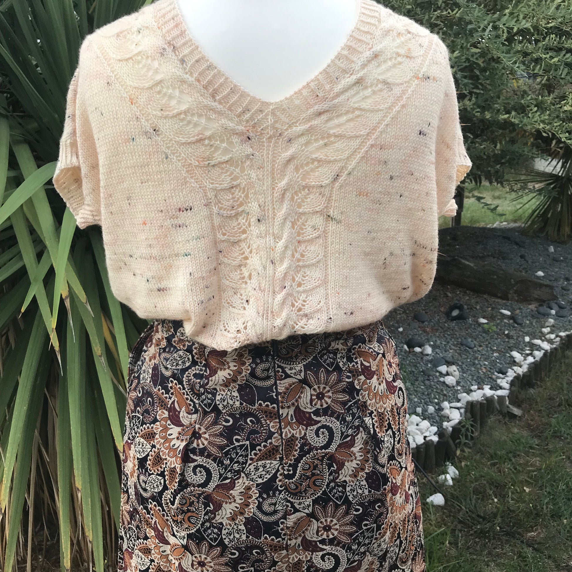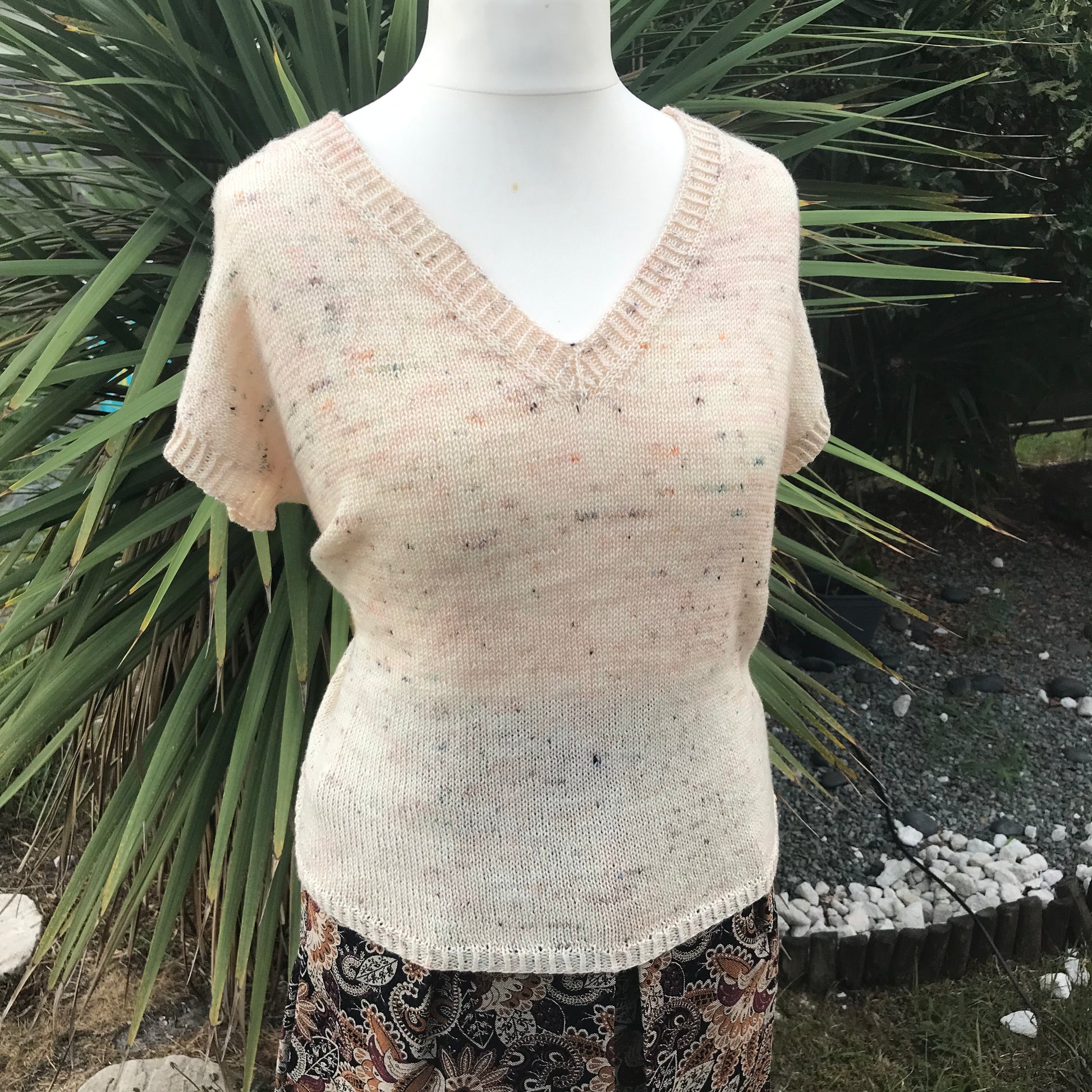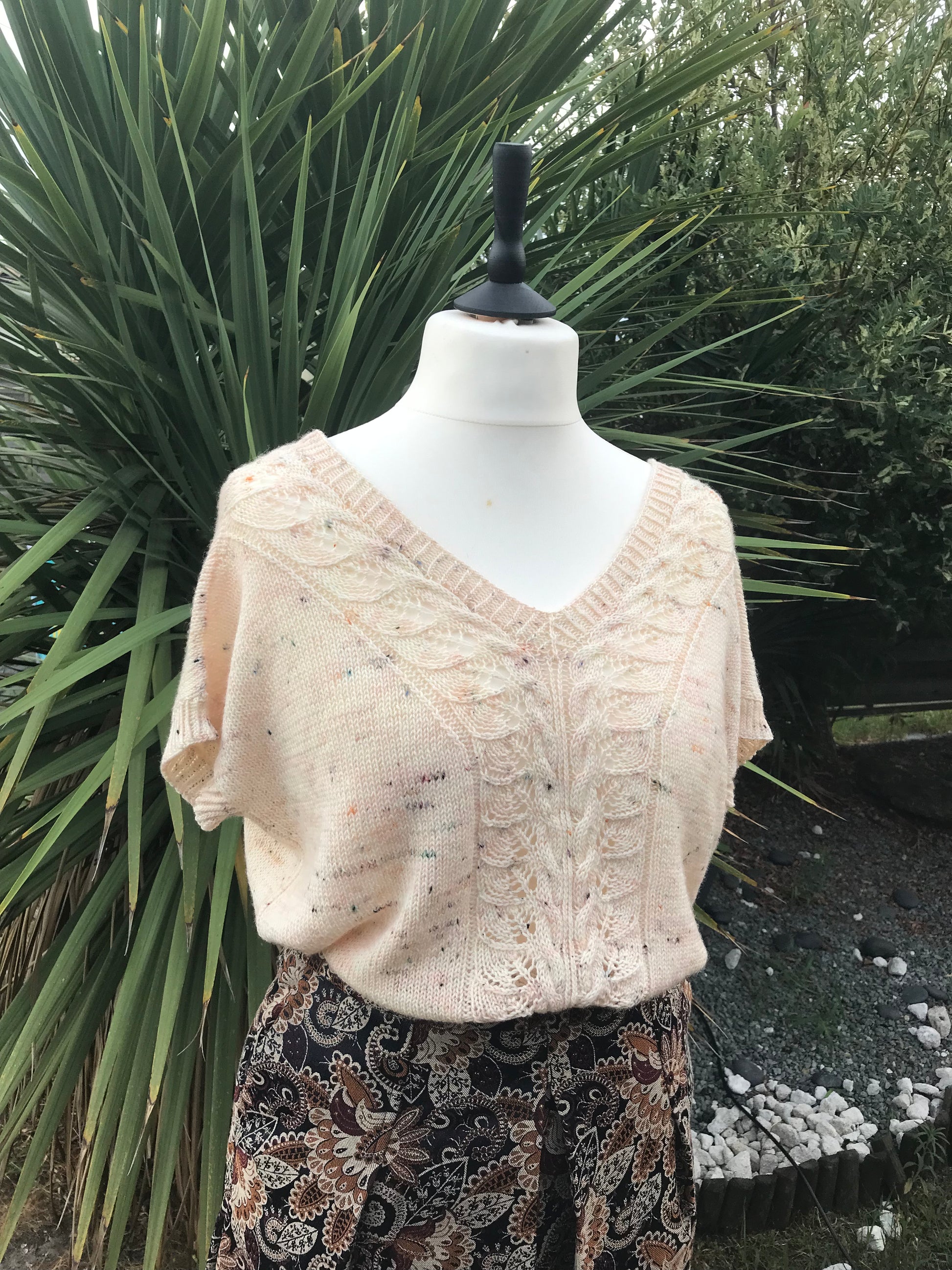 Le T-shirt Mademoiselle Kate est tricoté du bas vers le haut, avec un joli panneau de dentelle central qui viendra souligner l’encolure en V. Ce joli panneau de dentelle est prévu pour être porté comme vous le souhaitez, soit devant, soit derrière, au grés de vos envies et de vos folies.