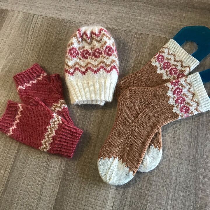 Tricotées en double (mérino + mohair), elles vont des côtes du poignet aux côtes des doigts. La question que l’on pourrait se poser en les tricotant serait : combien de paires vais-je me tricoter?