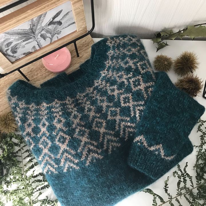 Le modèle présenté est réalisé en laine fingering doublée mohair pour un pull doudou qui t'accompagnera tout l’hiver, tu peux cependant le réaliser en laine type DK pour un effet moins poilu.