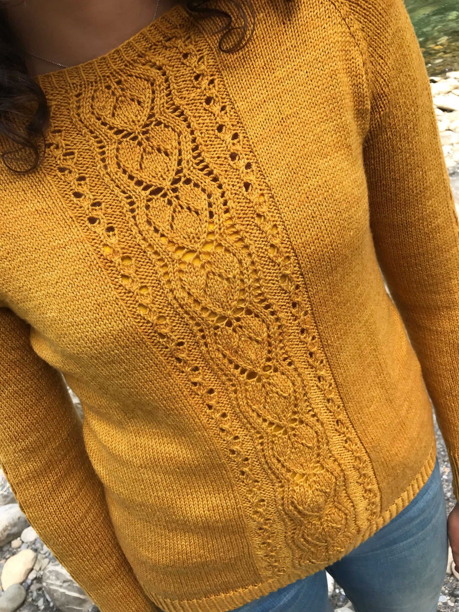 Johanna est un pull top-down, composé de raglans simples et de dentelles sur les manches et le devant. C’est ma petite œuvre d’art pour les 18 ans de ma petite sœur, tricoté en base mérinos de chez Yarneline, coloris Mme Bonheur.