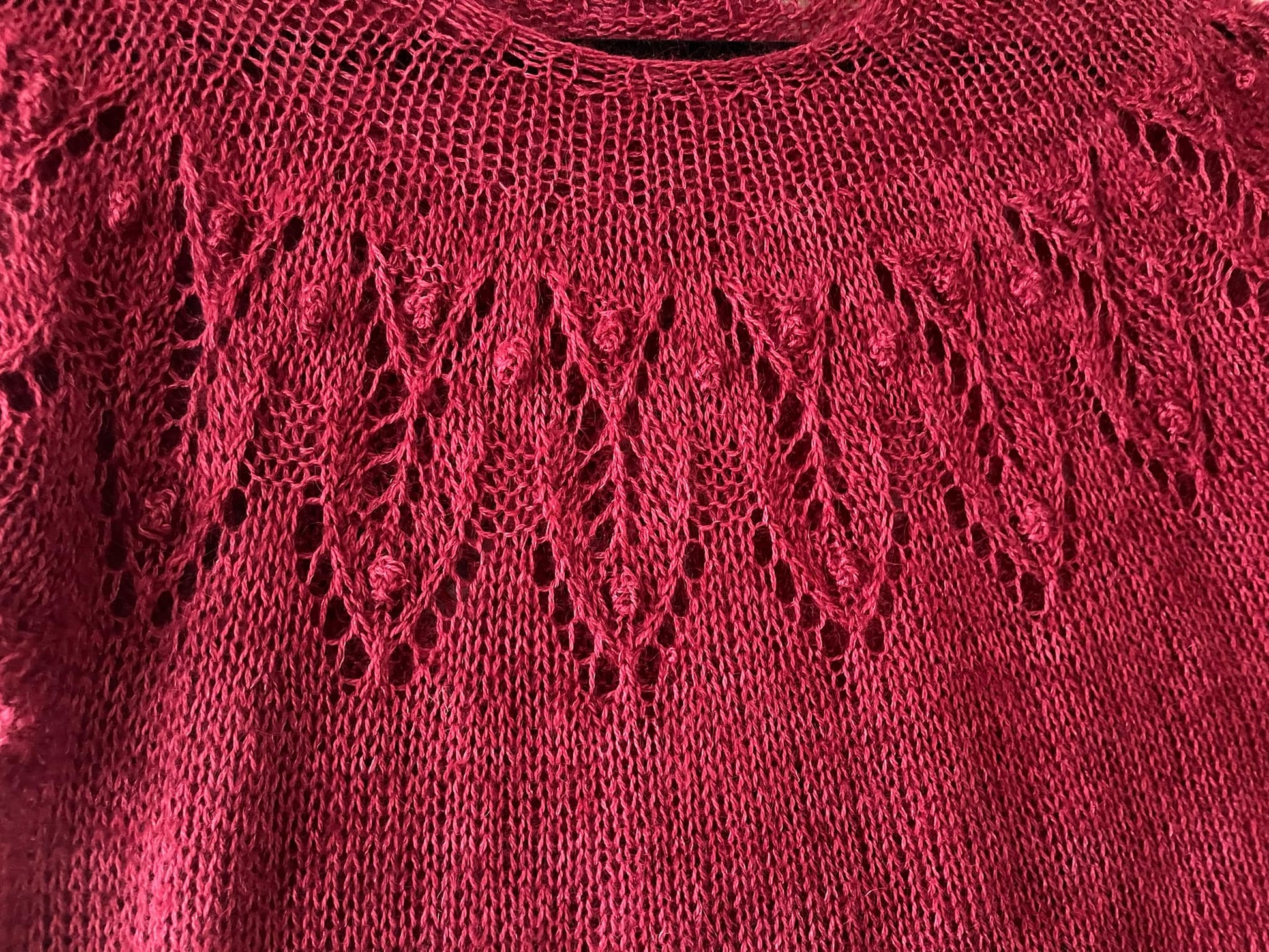 Tricoté d’une seule pièce, du haut vers le bas, il met en valeur un magnifique empiècement circulaire orné d’un motif de feuilles ajourées, comme une couronne végétale posée délicatement sur les épaules.