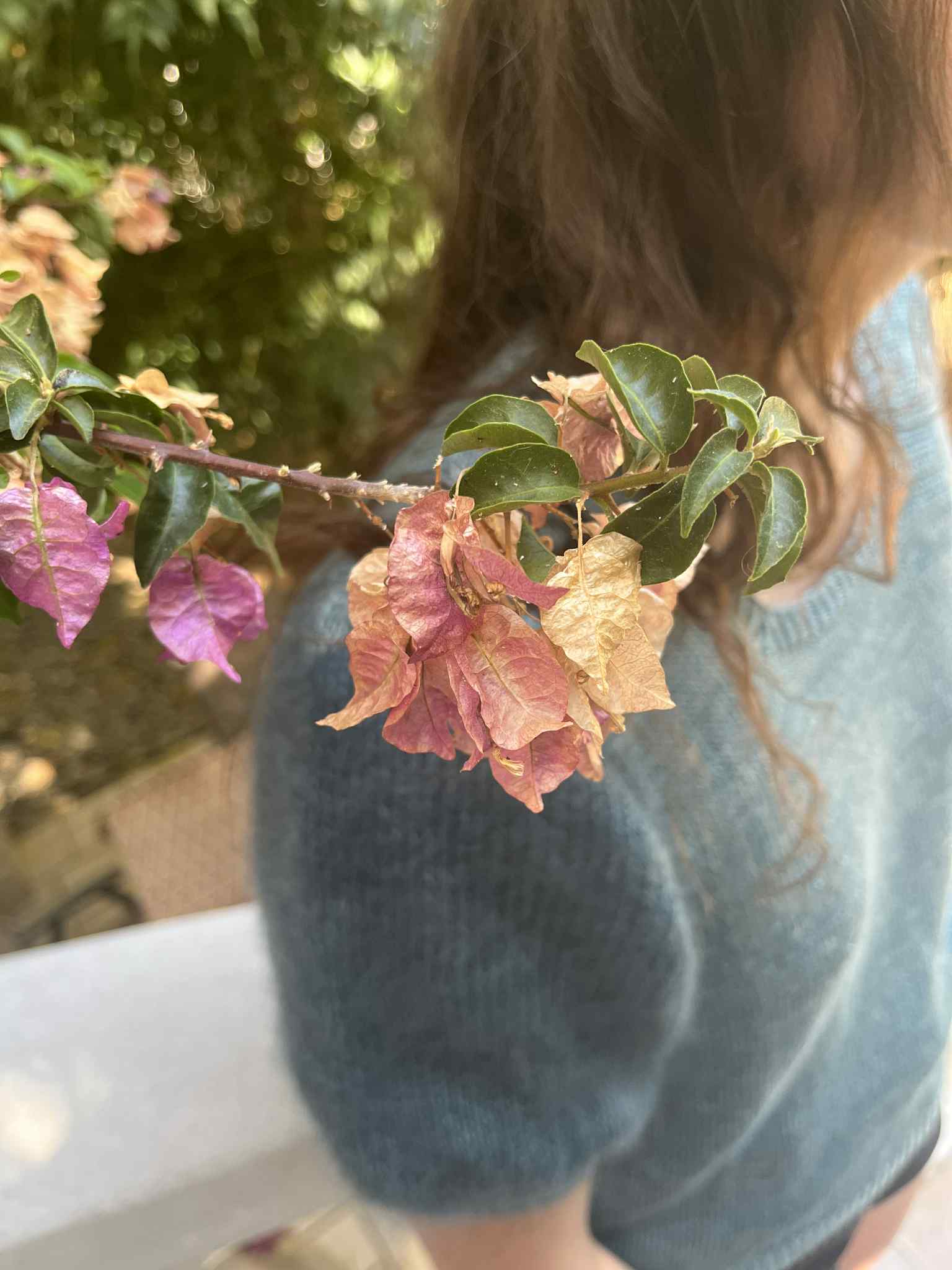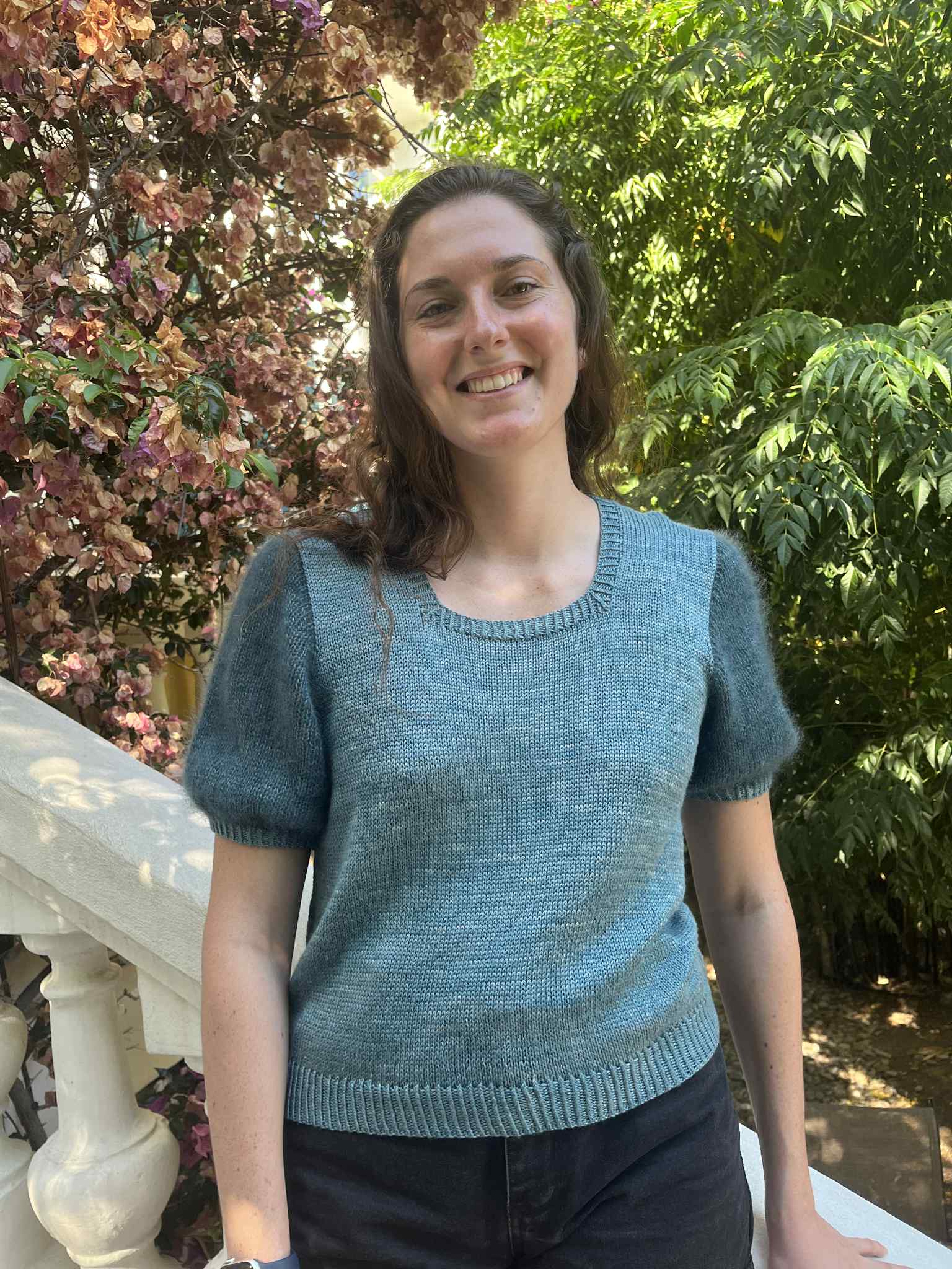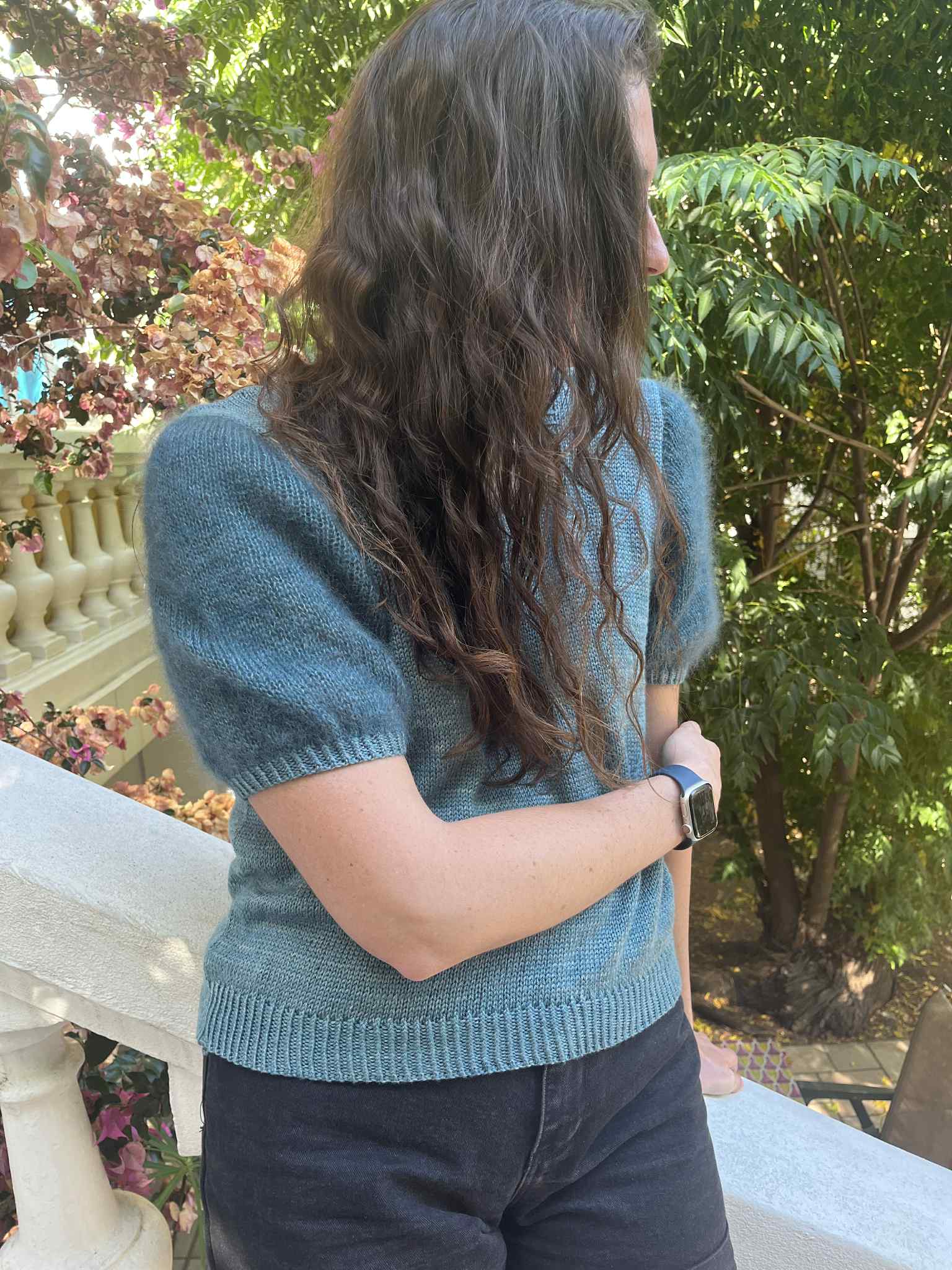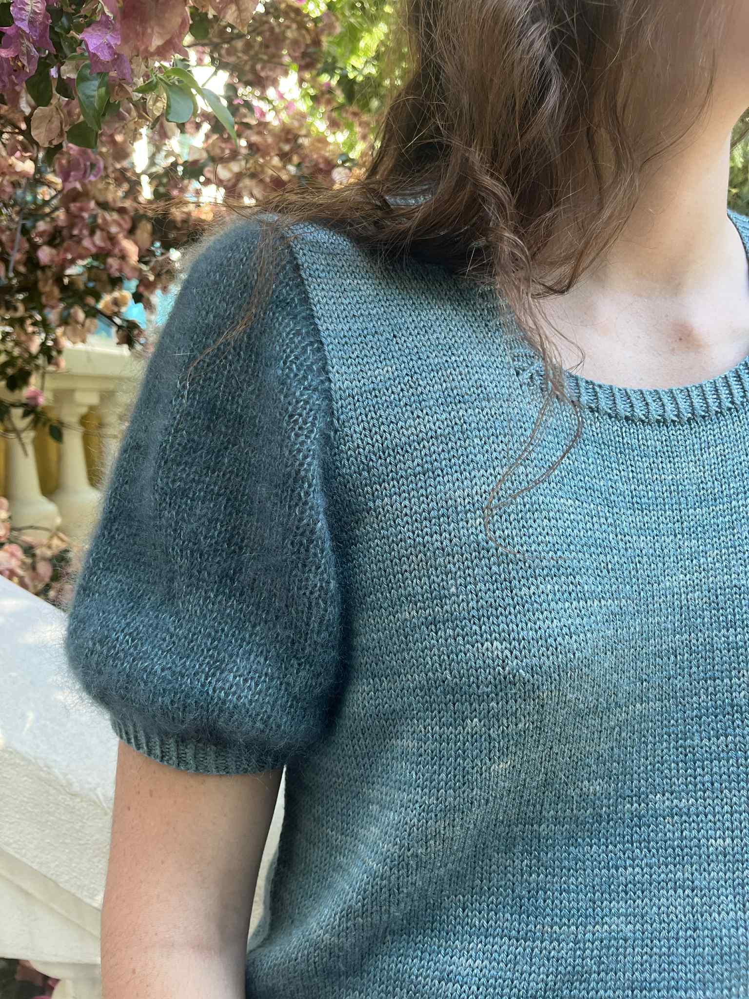 Tricoté du haut vers le bas, sans couture, il se compose d’un corps en jersey en fingering, simple et fluide, associé à de délicates manches montées en mohair, légèrement ballons, pour un effet vaporeux et féminin.